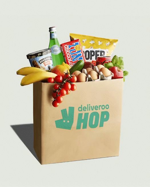 Elevating the everyday grocery world. We worked with Deliveroo to relaunch their instant grocery service, Hop. The photography shows products candidly in the home environment with ingredients and products shot in use on kitchen counters, featuring popular food and drink brands.